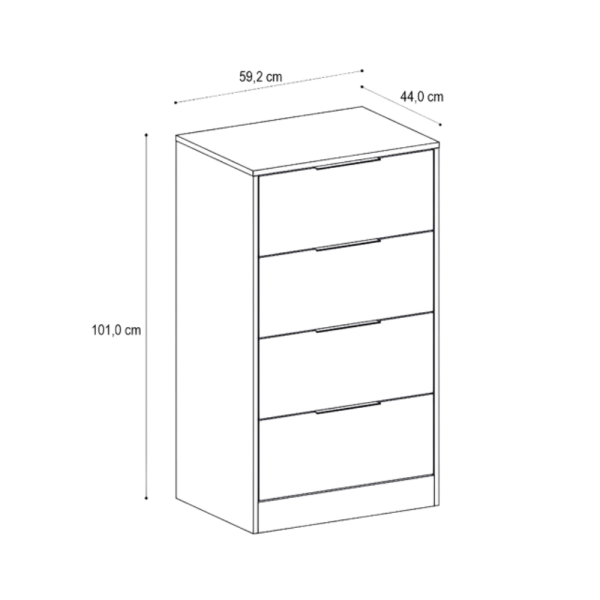 Chiffonier que consta de 4 cajones, todos con correderas metálicas para un funcionamiento mas suave y agradable. Cajones amplios y fuertes para soportar toda tu ropa!.- 4 cajones