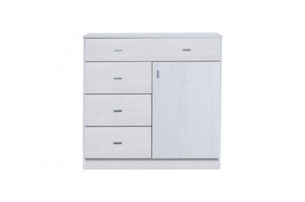 Comoda compuesta por 4 cajones con correderas metálicas: 3 sobre el lado izquierdo de la comoda y uno largo en la parte superior que abarca todo el ancho de la misma. Sobre el lado derecho cuenta con una puerta con un estante en su interior. Ideal para ordenar y guardar todas tus prendas.- 4 cajones con corredera metálica