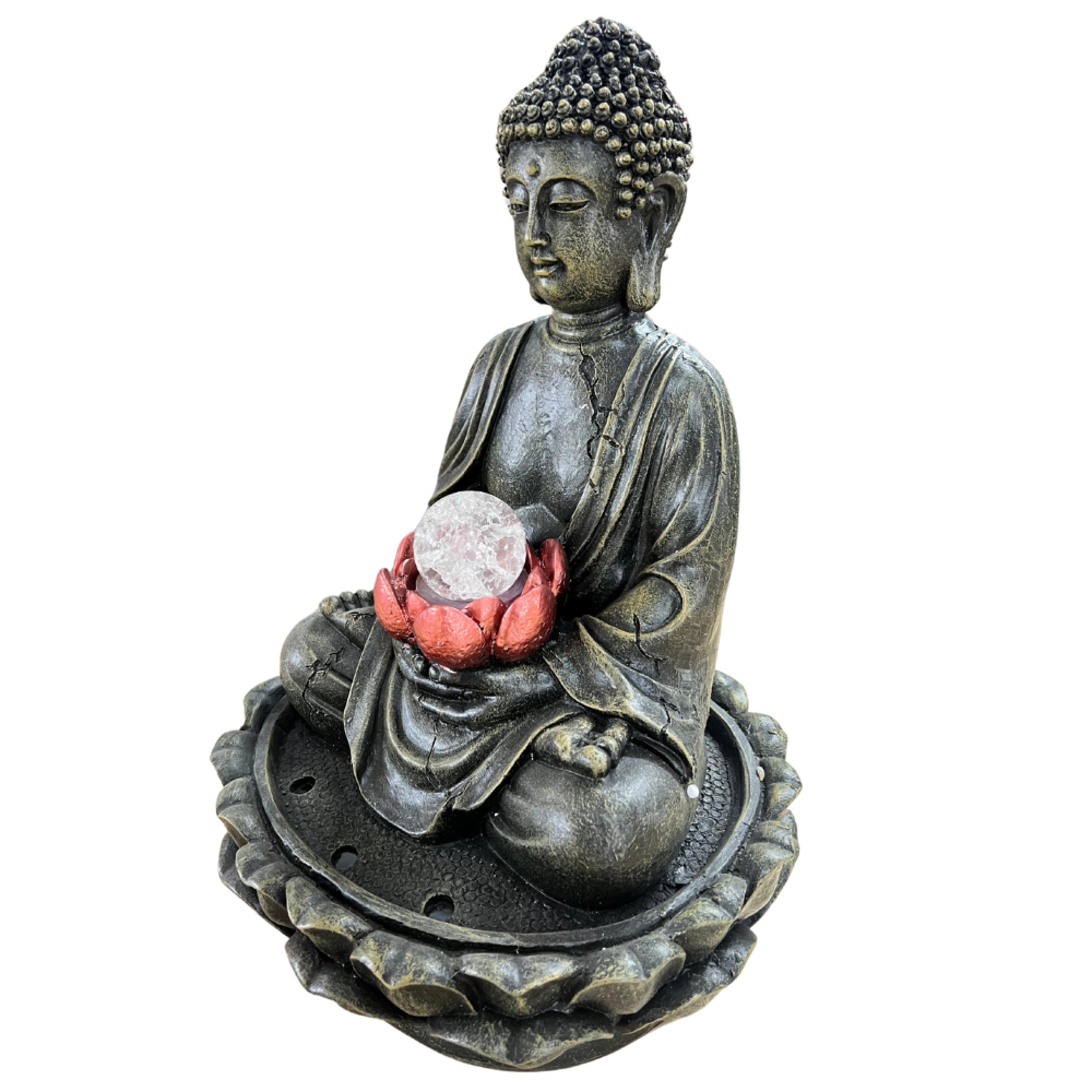 Fuente de agua buda con bola giratoria al centro.