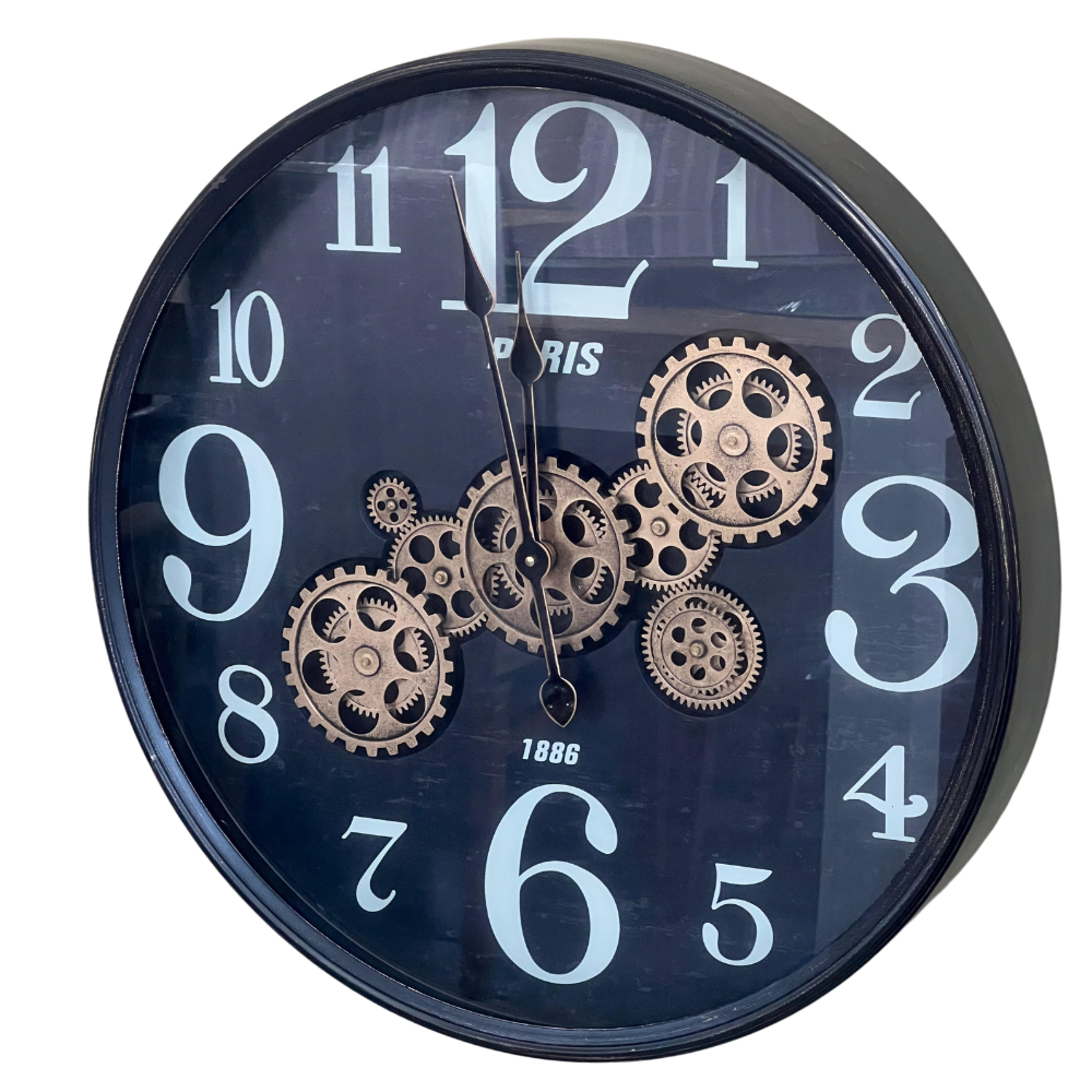 RELOJ DE 60 CM FONDO NEGRO - PARIS- NUMEROS COMUNES BLANCOS - ENGRANAJES DORADOS